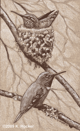 Rufous hummingbirds, colored pencil and gouache on toned paper