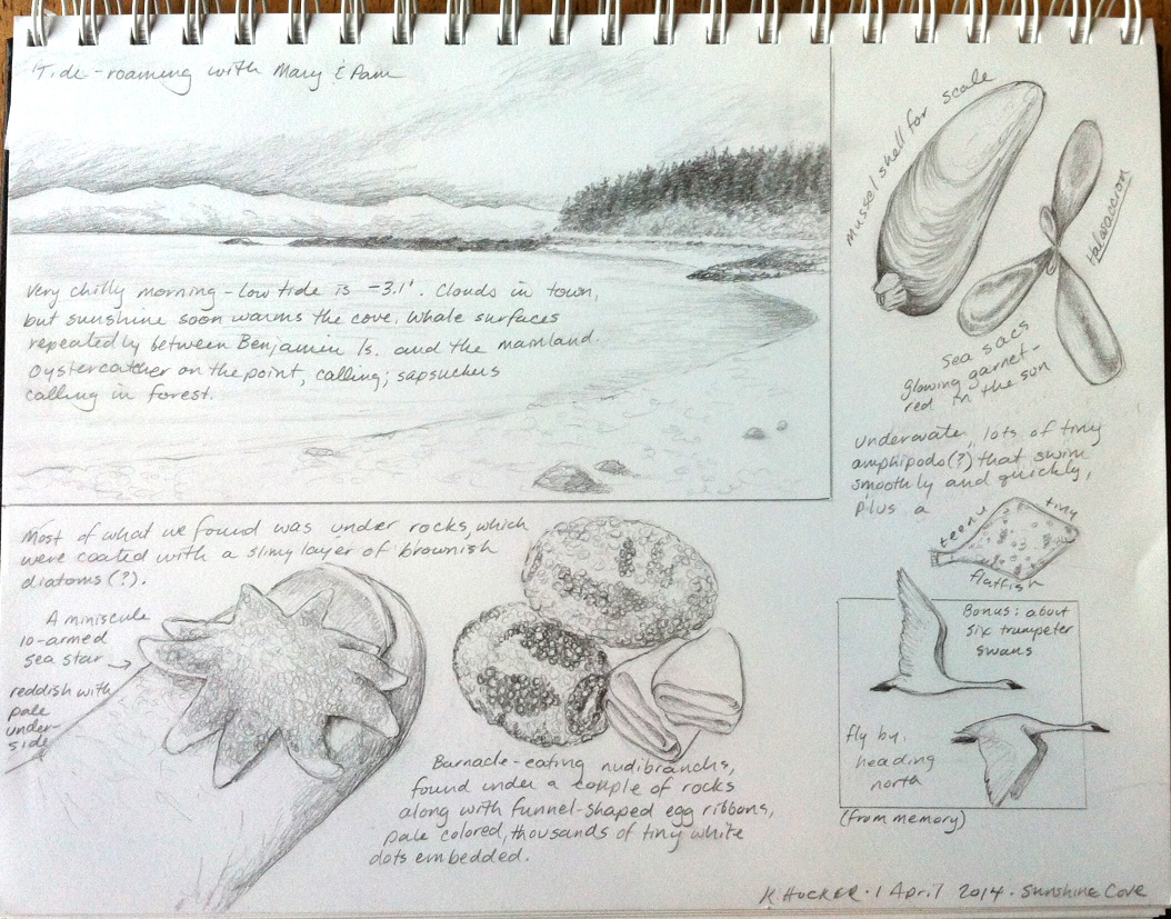 No fools were present (unless you count the three of us naturalists slipping and lurching among the diatom-slick boulders). Just a pleasant morning at Sunshine Cove, with a minus tide and lots of boulders to explore. We didn’t find anything particularly spectacular or surprising, but it was worth a sketch page…