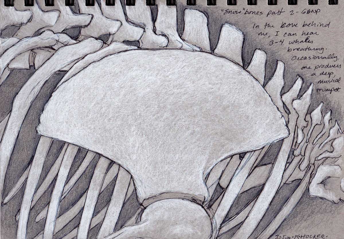 The recent installation of a humpback whale skeleton at Glacier Bay National Park has drawn me out to Bartlett Cove several times now to observe and sketch. At about 45 feet long, it’s is apparently the second largest humpback whale skeleton now on display in the world. The whale was a female, hit by a cruise ship in 2001. After she was towed to a nearby beach, her bones were collected and partially cleaned by the community of Gustavus, then cleaned further, restored, and assembled by Whales and Nails Studio in Maine.