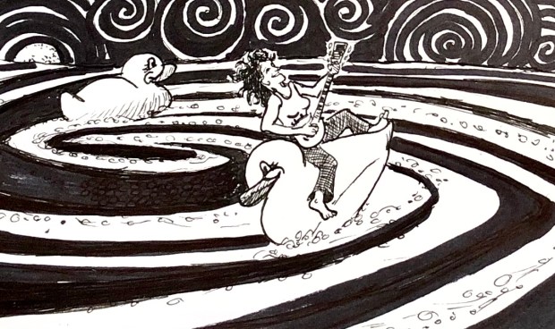 Today, Banjo Woman makes a reappearance. Riding on a rubber duck. In a whirlpool. Under a psychedelic sky. She may not be “dizzy.” But I am!