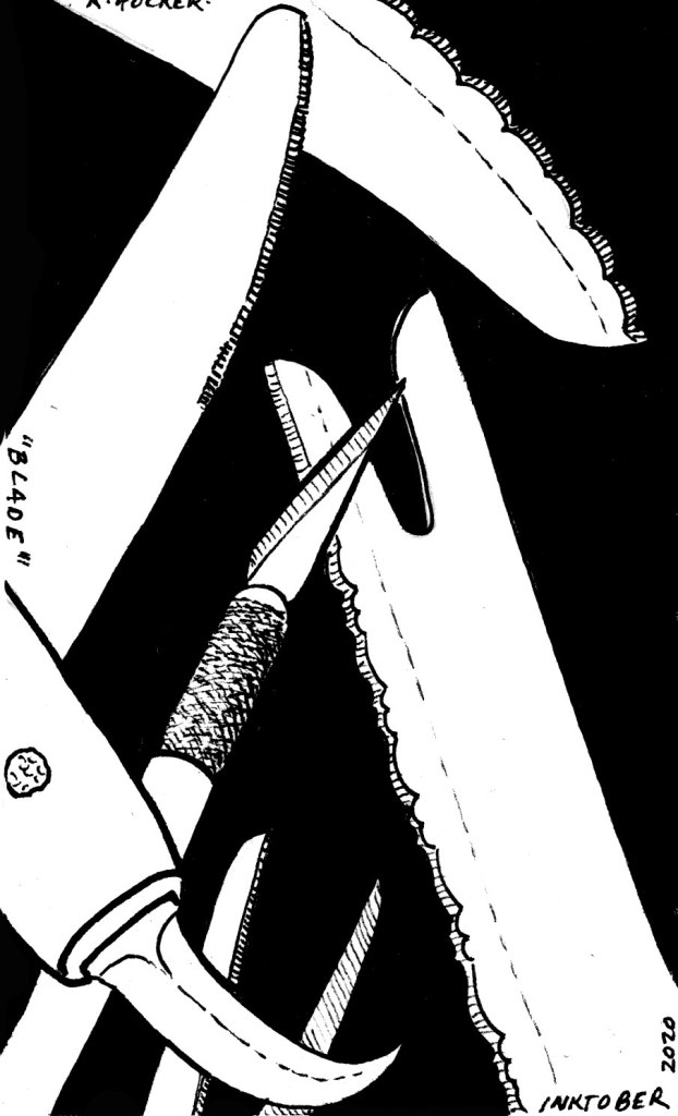 Today’s prompt was “blade.” I thought about blade shapes, and that led me to think about all the different types of blades that I own, which prompted me to think of all the blades I used just today. Here they are: steak/paring knife, butter knife, roast carving knife (I used it for bread), X-acto knife, yoo katan litáa (curved wood carving knife), and scissors.