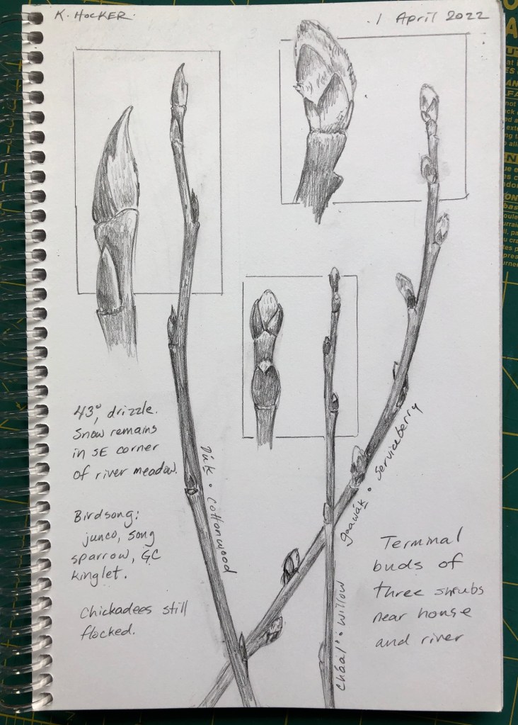 As usual, willows are among the first to start to open. But the serviceberry is also surprisingly bold. Both have early leaves and flowers that are protected by furry coats, so the risk is probably a little less for them than for, say, a spruce. Cottonwood’s buds are packed with aromatic sap, which gives the enclosed leaves some protection, but I haven’t seen any sign that they’re taking the chance yet.