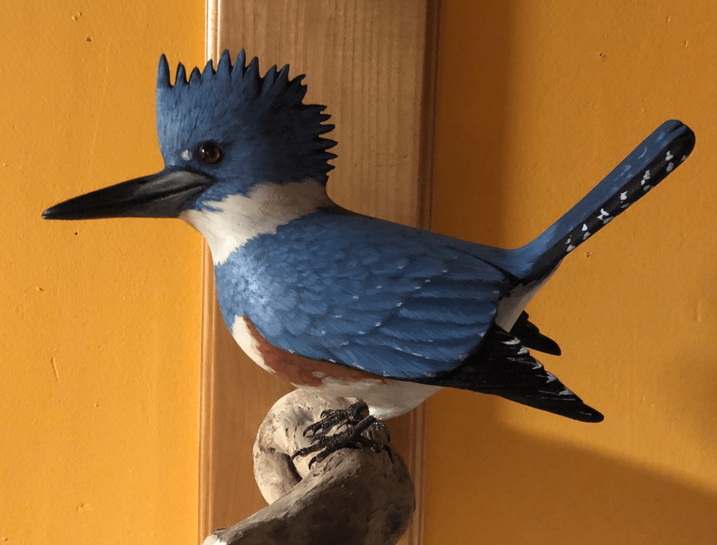 Carver friend Steve provided me with two new bird painting “assignments.” First was a kingfisher, which had quite a bit of wood patch-work so I decided to paint it completely rather than try to show the wood grain as I did with the owl last summer.