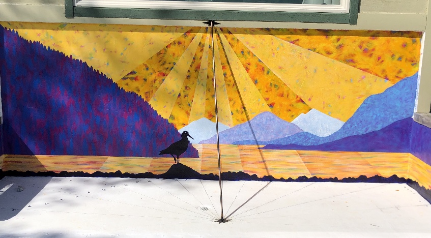 This summer I started painting. The sundial spot is not covered, so I’ve had to wait for dry days, but fortunately we’ve had a few good sunny spells lately. It’s been a treat to watch the shadow crawl across the mural as I work, and it has been really satisfying to watch it keep time.