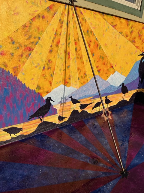 I finished the background on the vertical wall a couple of weeks ago. Last week, just in time for Solstice, I started adding the bird-silhouette hour markers. On each solar hour, the gnomon shadow will pass across the eye of a bird. The first bird I added is a favorite of Kim and Wayne’s: a black oystercatcher (lugán in Lingít). It’s at the noon hour.
